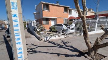 La colisión derribó la barda perimetral, destrozó el barandal y afectó un vehículo Toyota Camry que se encontraba en el interior del domicilio.