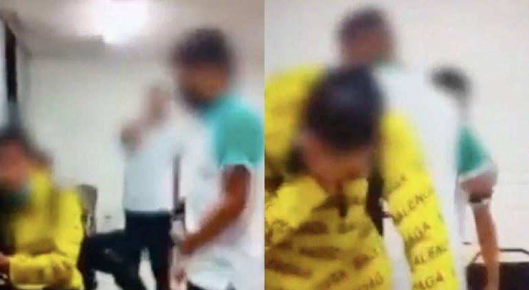 En las imágenes puede verse cómo el alumno de uniforme toma por el cuello a su compañero que estaba sentado y lo jala hacia atrás, al tiempo que puede escucharse como piden que cierren la puerta del salón.