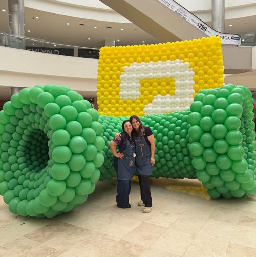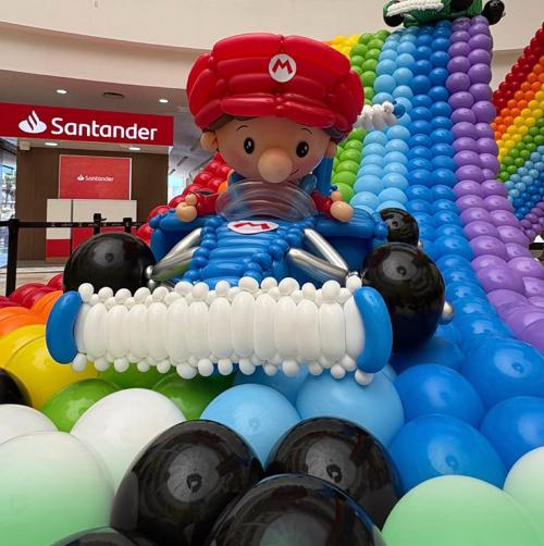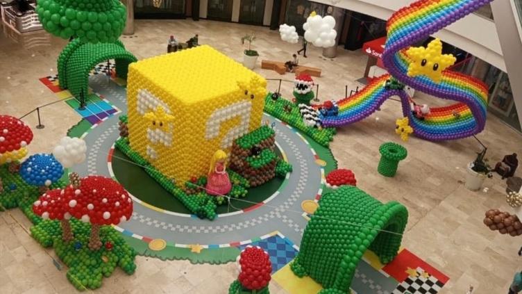 La instalación recrea escenarios y personajes del videojuego “Super Mario Bros” mediante estructuras elaboradas con globos. El proyecto fue desarrollado por un equipo de decoradores y artistas especializados en arte con globos.