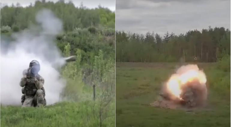 El Ministerio de Defensa ruso publicó este jueves un video que muestra cómo un grupo de sus fuerzas especiales, 'spetsnaz', destruye con lanzagranadas RShG-2 un convoy blindado.