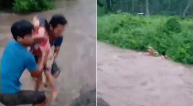 En las imágenes se muestra a los hombres que se lanzaron al agua fangosa, que corría rápidamente debido a las fuertes lluvias recientes, y lograron sacar a las menores.