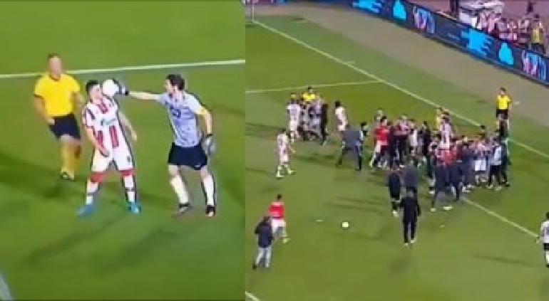 Ante esto, jugadores de Estrella Roja respondieron y comenzaron la pelea, la cual fue dispersada por el árbitro quien los sancionó.