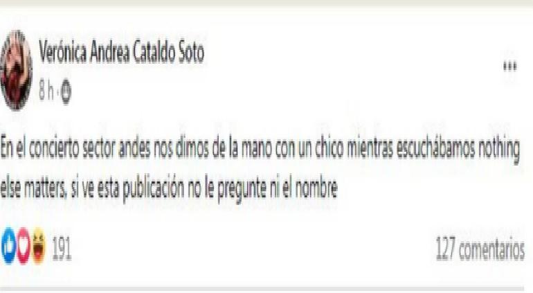 "En el concierto sector andes nos dimos de la mano con un chico mientras escuchábamos Nothing Else Matters. Si ve esta publicación, no le pregunté ni el nombre", puso en el post del grupo de la banda.