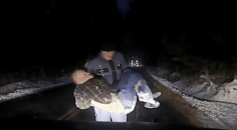 El video de la cámara del tablero muestra a un policía estatal de Maine ubicando a un anciano con la enfermedad de Alzheimer al costado de la carretera y sacándolo de una zanja en medio de temperaturas heladas.