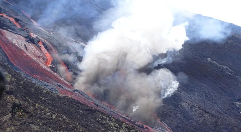 Plusieurs fissures se sont ouvertes sur le flanc est du #PitondelaFournaise entre la zone sommitale et 2000 m d'altitude. Les fontaines de lave ne dépassent pas 10 m de hauteur. Reconnaissance faite vers 13h30 avec le soutien d'Imaz Press Réunion @ipreunion. (Images ©OVPF/IPGP) pic.twitter.com/Rs93FXEbpK
