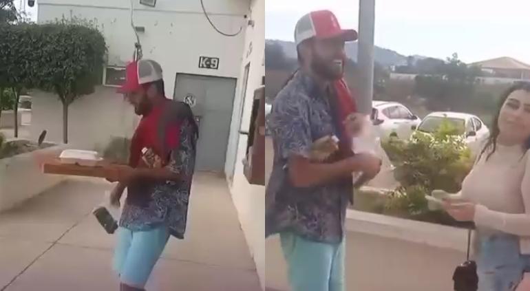 Viralizaron el momento en que el chofer del tráiler que se metió a a playa fue recibido por su novia con pizza y un jugo.