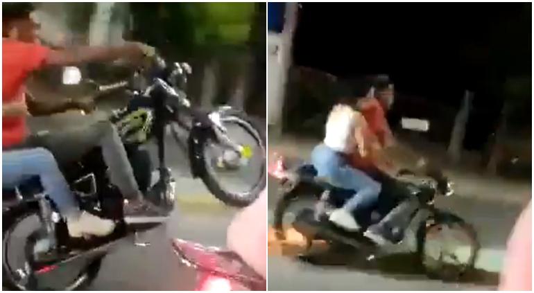 En las imágenes se aprecia que uno de los motociclistas intenta hacer un "caballito" sobre su vehículo, sin embargo, pierde el control del mismo.