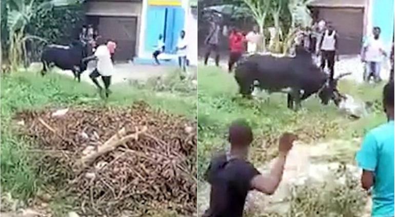 Este dramático video muestra el horrible momento en que una vaca embistió fuertemente a un hombre y lo lanzó al aire en Nigeria.