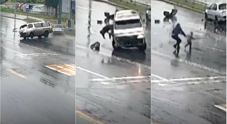 En un cruce de la ciudad de Jabárovsk, del Lejano Oriente de Rusia, un microbús realizó una maniobra prohibida y provocó un choque con otro vehículo, donde la vida de un pequeño peligró.