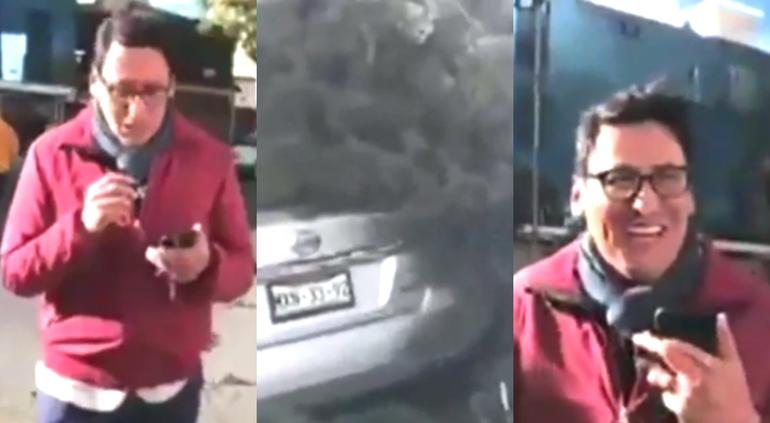 El reportero señaló en la transmisión el árbol que cayó sobre un auto Nissan por las fuertes ráfagas de viento en la zona, pero al dar a conocer las placas del propietario se percató que se trataba de su propio vehículo.