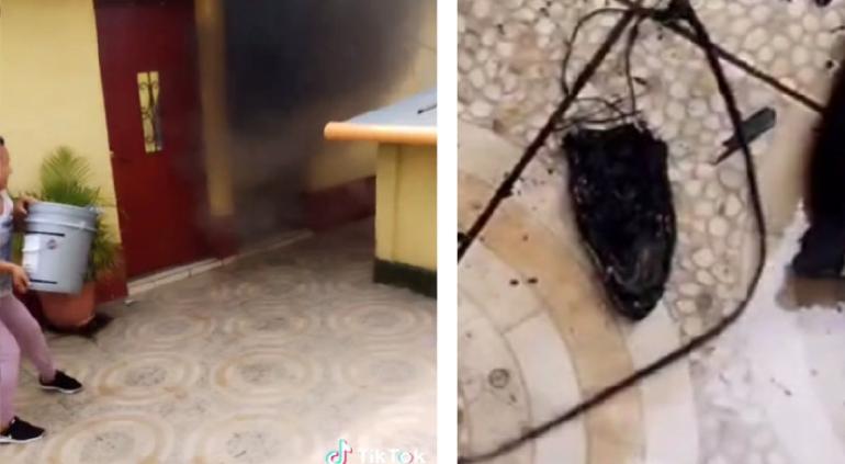 El momento ha logrado volverse viral, pues en el video se muestra como la familia intenta apagar a cubetazos la explosión que provocó el corto al no desconectar una plancha.