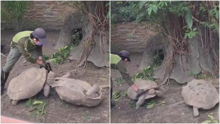 A través de las redes sociales, se viralizó el video en donde se puede ver cómo un cuidador tuvo que separar a dos tortugas gigantes macho que se dieron un agarrón en un zoológico, al grado de que una de ellas terminó por volcarse.