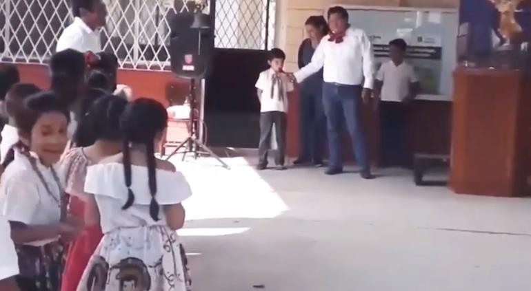 Su maestro le indica que debe decir “Viva México” en tres ocasiones, a lo que el menor, dice literalmente lo que se le indicó: “Viva México 3 veces”, haciendo nuevamente reír a sus compañeros.
