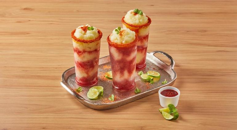 -En un vaso escarchado con chile, agrega de forma alterna un poco de la salsa, y mezcla del frappé hasta llenarlo; repite con el resto de los ingredientes. Decora con las hojas de menta y ofrece.