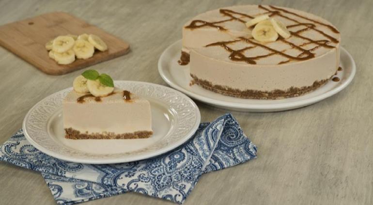 -Desmolda el pay y decora con un poco de leche condensada y sirve con rodajas de plátano y menta.