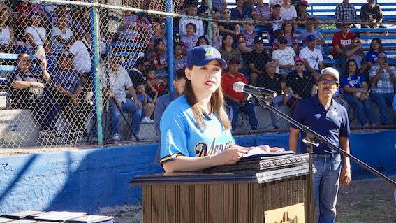 La alcaldesa de Meoqui, Miriam Soto, en el Torneo Internacional de Béisbol 40-60.