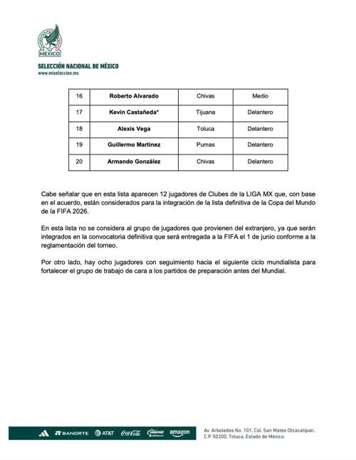 La Federación Mexicana de Futbol aclaró que esta convocatoria únicamente contempla jugadores de clubes de la Liga MX, mientras que los futbolistas que militan en el extranjero serán integrados posteriormente en la lista definitiva que será entregada a la FIFA el próximo 1 de junio.