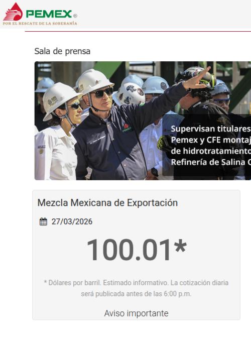 Petróleos Mexicanos (Pemex) cerró la semana hábil la tarde del 27 de marzo con barril de mezcla mexicana de exportación llegó a los 100.01 dólares.