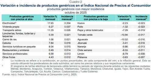 Luego, mostró en una tabla los productos genéricos que tuvieron mayor incidencia a la alza en la inflación entre el 1 y 31 de octubre: