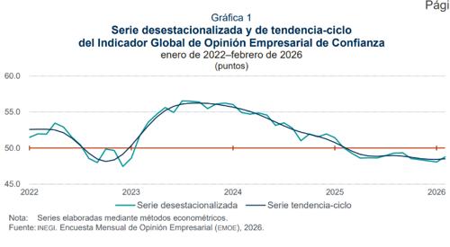 El Inegi publicó el Indicador Global de Opinión Empresarial de Confianza que se ubicó en 48.8 puntos para el cierre de febrero, lo cual es 0.7 puntos más que en enero y 1.3 puntos menos que en febrero de 2025.