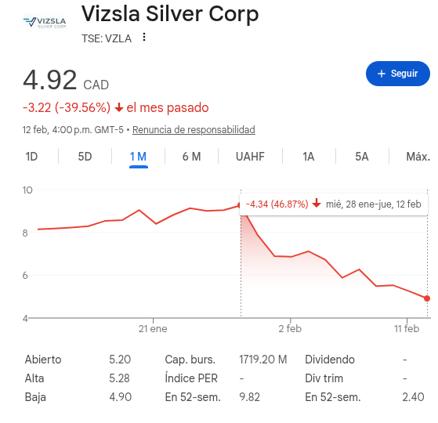 En la bolsa canadiense, las acciones de Vizsla (TSE:VZLA) han caído un 21.53% desde el 9 de febrero, la fecha en la que confirmó en un comunicado la muerte de los trabajadores desaparecidos en el municipio de Concordia, en Sinaloa.
