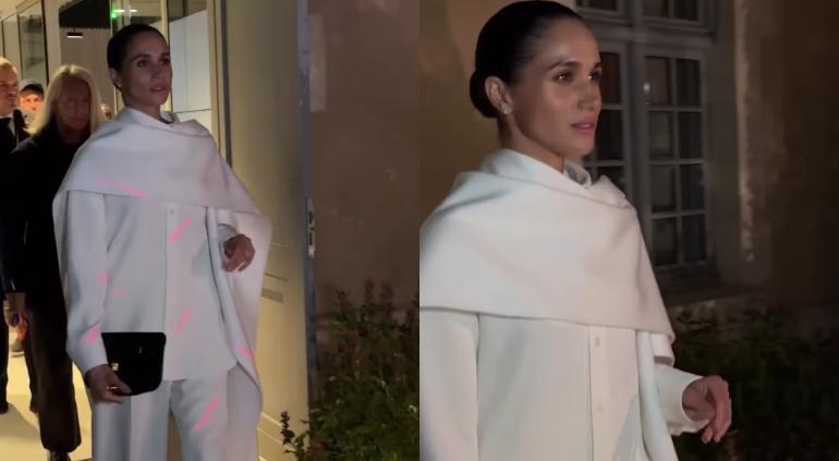 La duquesa de Sussex llegó ataviada en un traje blanco con chalina, cabello recogido y un bolso de mano en color negro.