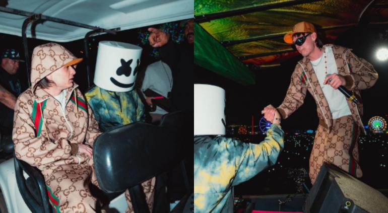 En una serie de fotografías compartidas en sus redes sociales cuando estuvo presente en el festival de música EDC 2023, el cantante vistió un conjunto de sudadera y pants de la marca Gucci, la cual combinó con unos tenis de la misma marca y una camiseta blanca.