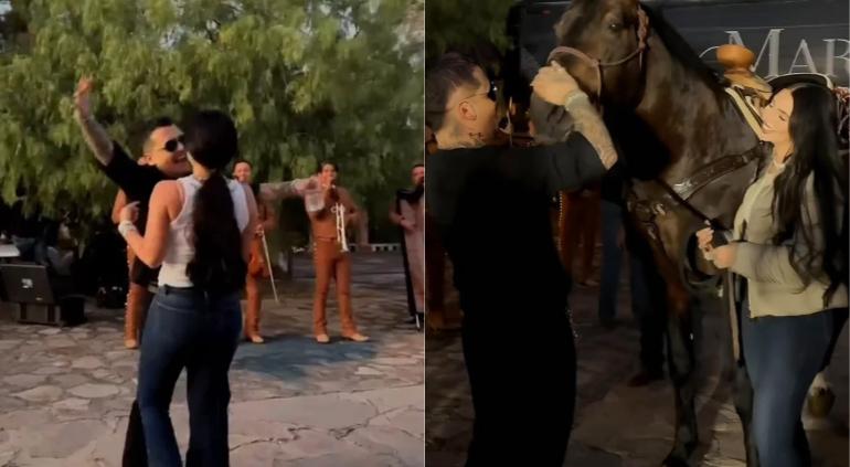 En el video también se aprecia a Ángela Aguilar montando al caballo minutos antes de entregarlo, reforzando el carácter simbólico del regalo y su conexión con las raíces culturales que ambos artistas han promovido públicamente.