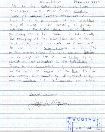En el documento, dirigido al juez Brian Cogan, el exlíder del Cártel de Sinaloa pidió que se respeten sus derechos y que reciba un trato justo por parte de las autoridades.