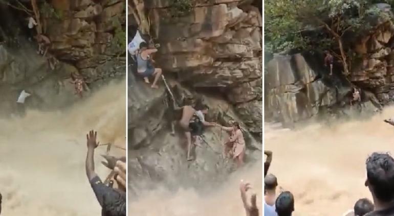 Un video difundido en las redes sociales muestra el momento en que agentes forestales del estado indio Tamil Nadu rescatan a una mujer y a su hijo, atrapados por las inundaciones en las cascadas de Anaivari, en el distrito de Salem, India.