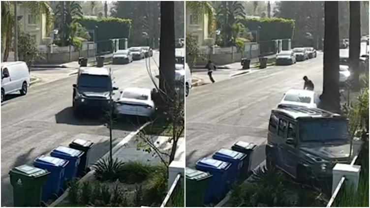 MOM TAKES ACTION: A Los Angeles mother rammed her Mercedes G-Wagon into the getaway car of these suspected burglars after receiving a panicked call from her kids who said intruders were trying to break into their home.