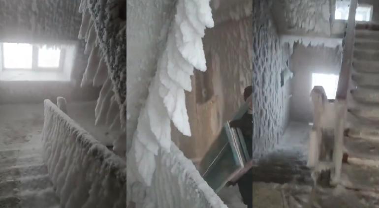 En el video, se puede ver cómo las escaleras, los techos, las ventanas y las puertas del edificio están totalmente congelados, llenos de nieve y estalactitas de hielo. Las cuales pueden moverse al paso de la persona que va grabando.
