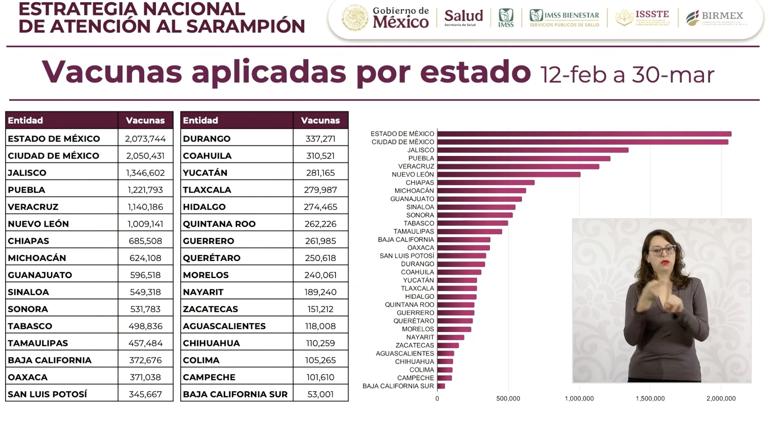 El subsecretario de Integración Sectorial y Desarrollo de la Secretaría de Salud, Eduardo Clark García Dobarganes, informó que la transmisión del sarampión en México muestra una tendencia a la baja en las 32 entidades del país, tras la aplicación de 17.2 millones de vacunas en siete semanas.