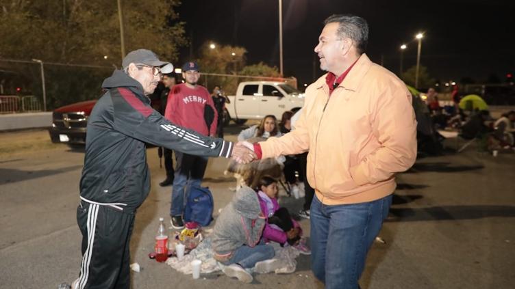 El alcalde Cruz Pérez Cuéllar visitó anoche a cientos de personas que acamparon al exterior del Parque DIF para recibir regalos de Santa Bombero.
