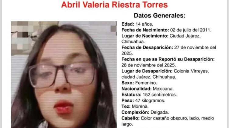 La Fiscalía General del Estado de Chihuahua activó Alerta Amber para localizar a la adolescente Abril Valeria Riestra Torres, de 14 años, quien desapareció el miércoles 27 de noviembre de 2025 en la colonia Virreyes de Ciudad Juárez.
