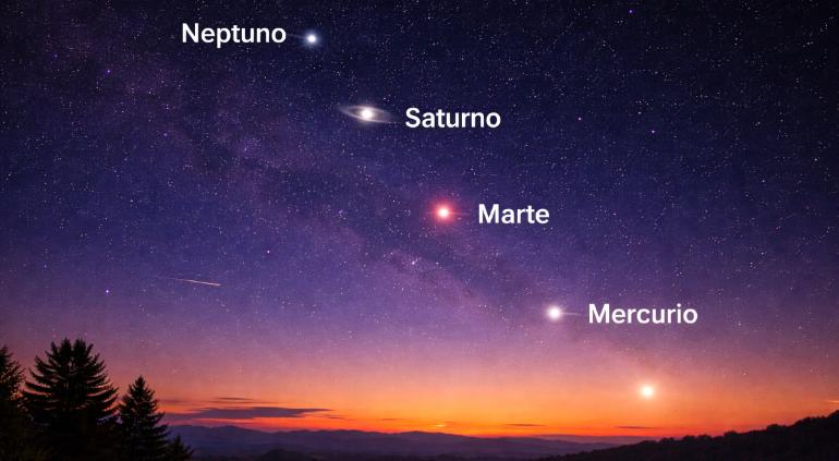 Los cuerpos celestes que podrán apreciarse son Mercurio, Marte y Saturno mientras que Neptuno también forma parte de la alineación, aunque no es visible a simple vista, se necesita de un telescopio.