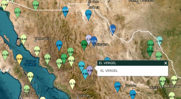 - La estación ubicada en la localidad El Vergel, municipio de Balleza, detectó a las 6:10 a.m. de este domingo una temperatura de -4.4 grados Celsius.