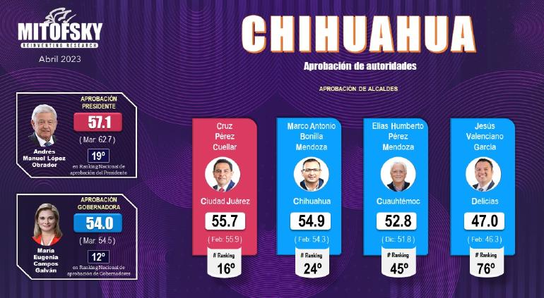 La encuestadora Mitofsky publicó los resultados de la aprobación del mes de abril del presidente Andrés Manuel López Obrador y la gobernadora Maru Campos.