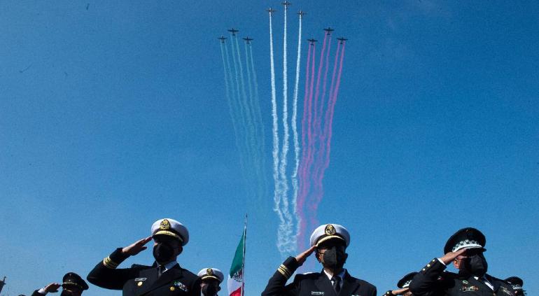 El presidente Andrés Manuel López Obrador encabezó la entrega de ascensos y condecoraciones militares y el pase de revista en el desfile de la Revolución que tuvo exhibición aérea.