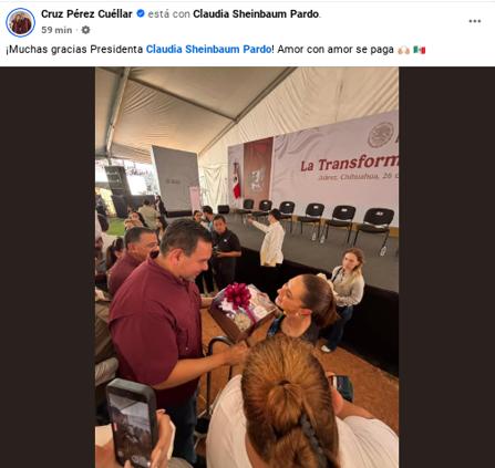 Tras el informe presentado esta tarde en Ciudad Juárez, el Presidente Municipal, Cruz Pérez Cuéllar, entregó a la presidenta de México, Claudia Sheinbaum Pardo, un conjunto de regalos elaborados por mujeres indígenas de la ciudad