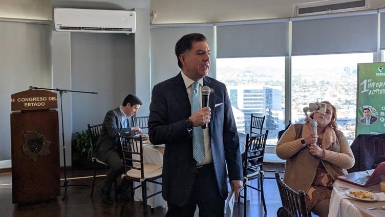 Desde el Salón Legisladores, que se ubica en el piso 18 del Congreso del Estado, Borunda Quevedo describió su quehacer legislativo y territorial durante el último año, que definió como un período centrado en tres ejes: la infraestructura social, la defensa de las áreas naturales y la vinculación con las autoridades federales.