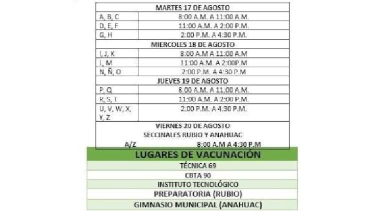 El próximo martes 17 de agosto iniciará la jornada de vacunación para la aplicación de la segunda dosis contra el COVID-19 a personas de 30 a 39 años en la ciudad de Cuauhtémoc, Chihuahua.