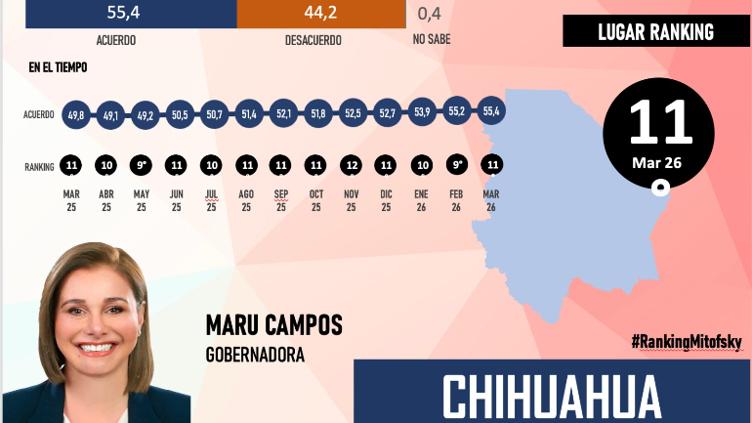 La aprobación de Maru Campos Galván, gobernadora de Chihuahua, subió al 55.4%, de acuerdo con Consulta Mitofsky que lo describe como un “crecimiento sostenido”.