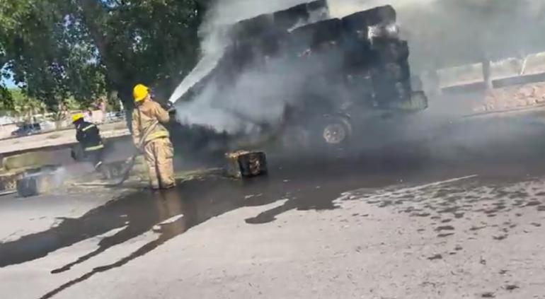 En cuestión de minutos, el fuego se propagó y consumió casi toda la carga del camión.