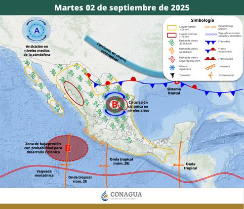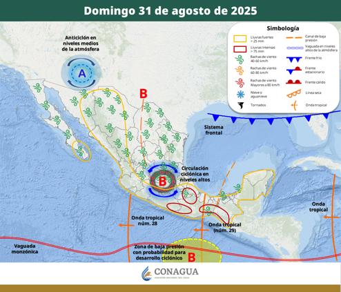 Es a partir del lunes, primero de septiembre, cuando esperan lluvias muy fuertes a puntuales intensas (75 a 150 mm) en el oeste del estado, las temperaturas máximas seguirían en el rango de 35 a 40°C y viento de 40 a 50 km/h con rachas de 50 a 70 km/h con posible formación de torbellinos.