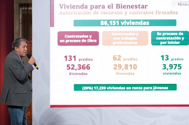Precisó que 52,366 viviendas ya están contratadas y en proceso de obra dentro de 131 predios; además, 29,810 viviendas avanzan con trabajos preliminares. Un bloque adicional de 3,975 viviendas se encuentra en proceso de contratación. “El 20 por ciento se destinará a jóvenes que estudian, trabajan o requieren vivienda en renta”, afirmó.