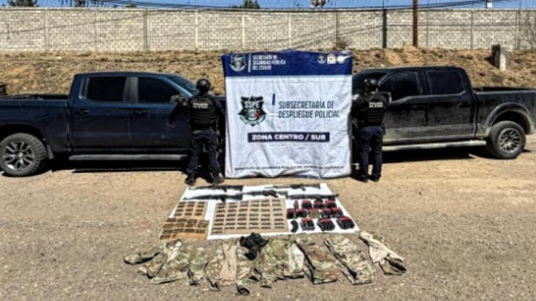 Durante una inspección más detallada en el interior de las pick up, Ford F-150 y Chevrolet Silverado 1500, los elementos localizaron 5 armas largas, 56 cargadores y 712 cartuchos útiles, además de diversas prendas tácticas de tipo militar.