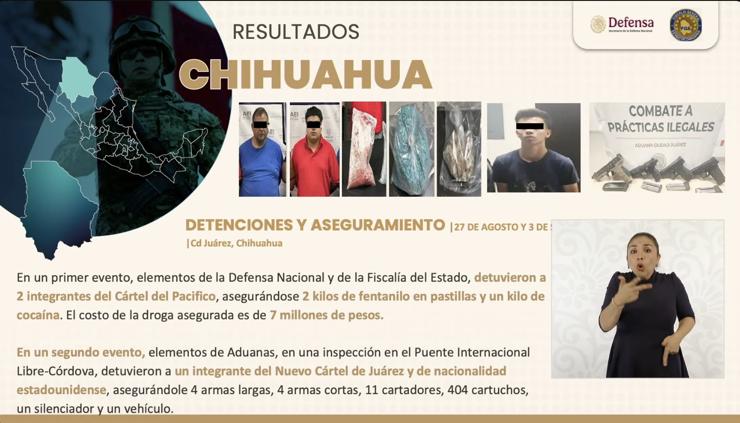 El secretario de Seguridad y Protección Ciudadana, Omar García Harfuch, informó que en Ciudad Juárez, Chihuahua, fueron detenidos dos presuntos integrantes del Cártel del Pacífico con dos kilos de fentanilo en pastillas y un kilo de cocaína, además de un ciudadano estadounidense con armas y cartuchos.