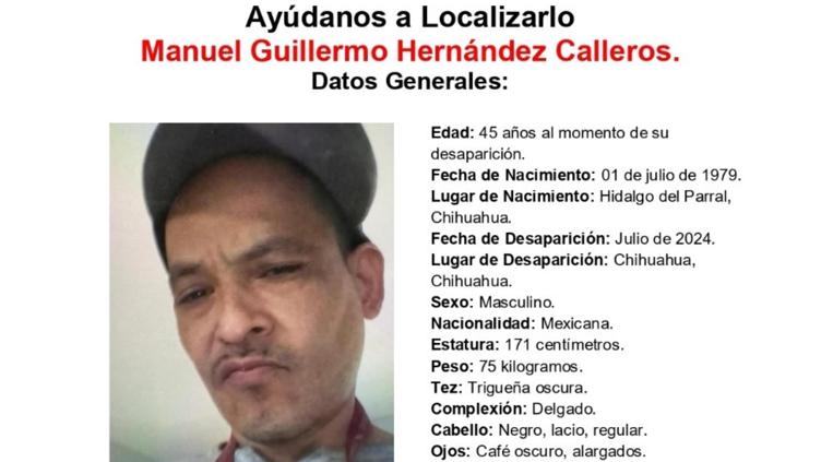 La Fiscalía General del Estado de Chihuahua emitió una pesquisa para localizar a Manuel Guillermo Hernández Calleros, quien fue visto por última vez en julio de 2024 en la ciudad de Chihuahua.