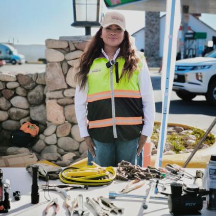 Pamela Hernández, residente de obra Centro SICT Chihuahua, mostró en otro video el equipo que llevan las cuadrillas para dar asistencia: herramienta menor, aceite para frenos, bandereros, cables para pasar corriente, gasolina, agua, botiquín de primeros auxilios, torreta, lámpara.